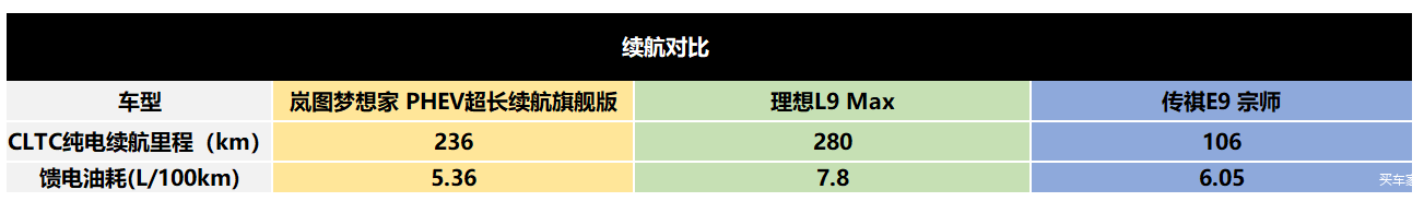 并且,像新岚图梦想家和理想L9,因为都有200多km的纯电续航,市区内基本可以当电车开,用车成本会节约一大笔,充电频率也不会太高。而传祺E9这方面会相对欠缺,100+km的纯电续航,除非有家充条件,每天出门保证满电,不然还是建议主要当油车开就好。