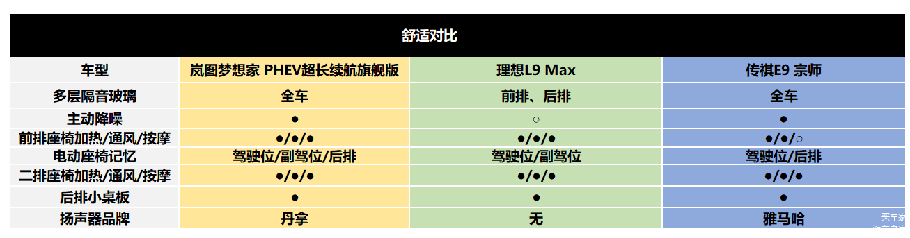 另外,油耗方面,三台车相比传统奶爸车都省很多,不过根据官方公布的亏电油耗表现来看,新岚图梦想家表现最佳,亏电百公里油耗5.36L;传祺E9其次,馈电百公里油耗6.05L,而理想L9的馈电百公里油耗最高,为7.8L。值得一提的是,新岚图梦想家还是三款车中整备质量最大的,能耗表现反而最佳。