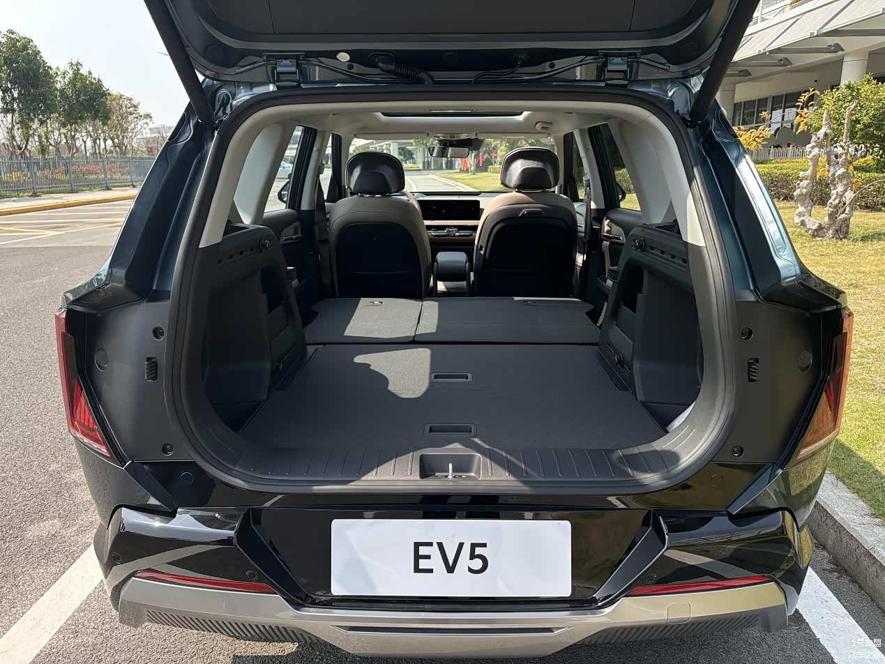 当然,这个后备箱让我惊讶的还不止于此。在放倒第二排之后便会发现,起亚EV5的二排座椅带有一个具备磁吸功能的背板,配合上可下沉的二排座椅,整个后备箱可以达到真正意义上的“纯平”,空间也能进一步拓展到1718L,对于喜欢短途出行,喜欢在车内过夜的小两口来说,真的是非常方便。