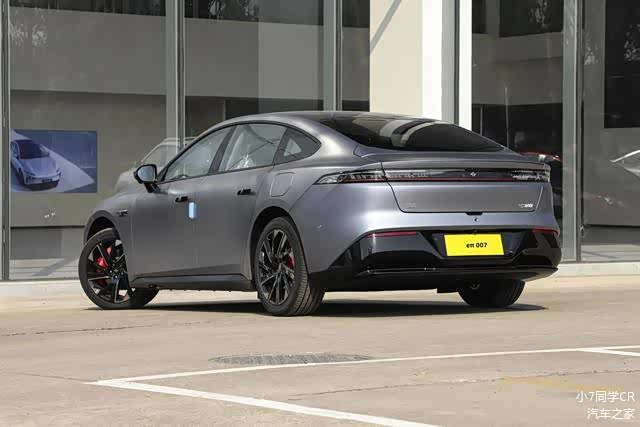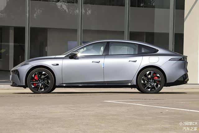 来到车身侧面,东风奕派π 007的侧面造型修长且舒展,溜背式车身造型+隐藏式门把手+大尺寸熏黑轮毂+红色刹车卡钳等设计元素,使得新车具备较好的时尚动感属性。同时,新车还提供了18英寸轮毂(235/50 R18)、19英寸轮毂(235/45 R19)。
