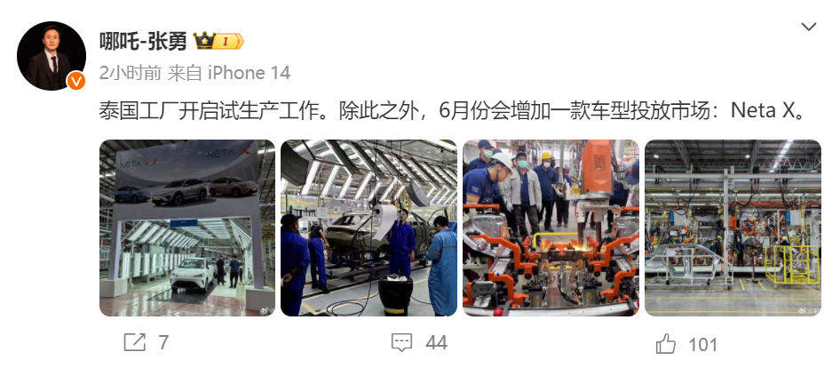 3月14日,盖世汽车获悉,哪吒汽车CEO张勇在社交平台发文称,哪吒汽车将于(今年)6月向泰国市场增加投放Neta X车型。