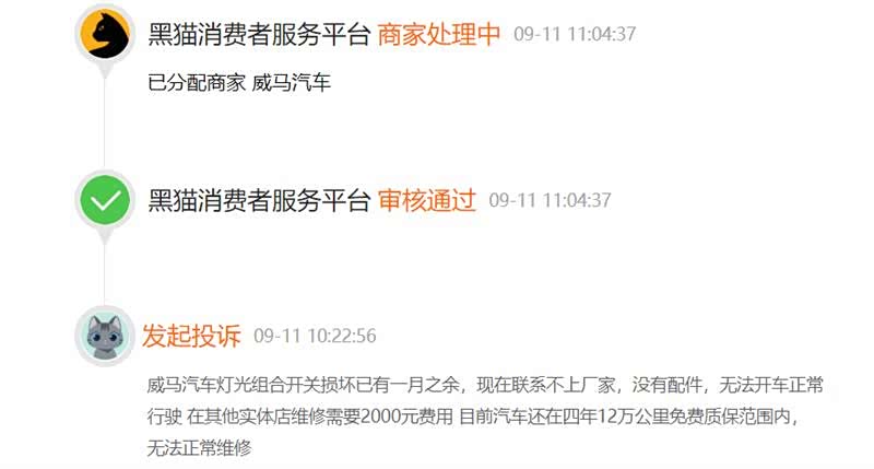 同年9月,另外一位2019款威马EX5 Lite探索版520的威马车主在平台投诉称,“威马汽车灯光组合开关损坏已有一月之余,现在联系不上厂家,没有配件,无法开车正常行驶 在其他实体店维修需要2000元费用 目前汽车还在四年12万公里免费质保范围内,无法正常维修。”