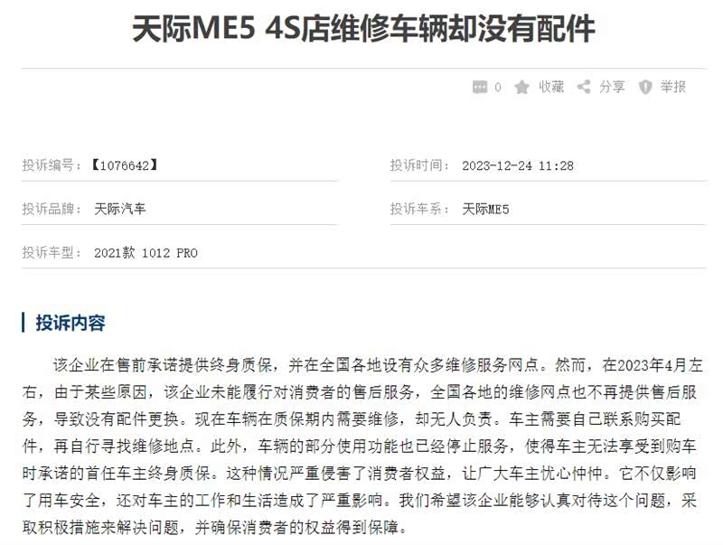 而他们的车主遭遇与威马车主相同,一名天际ME5车主在网上投诉称,“该企业在售前承诺提供终身质保,并在全国各地设有众多维修服务网点。然而,在2023年4月左右,由于某些原因,该企业未能履行对消费者的售后服务,全国各地的维修网点也不再提供售后服务,导致没有配件更换。”