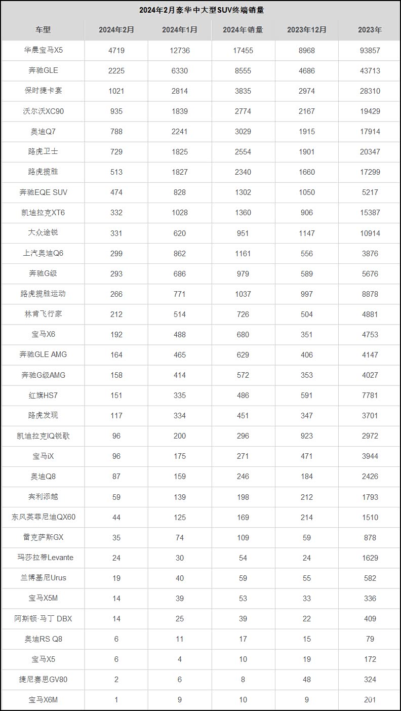 豪华中大型SUV市场是一个竞争非常激烈的市场,借助国产降价和轴距加长,华晨宝马X5成为这个细分市场的销量领跑者,2024年2月终端销量4719辆,今年前2个月售出17455辆。进口宝马X6的2月终端销量为192辆,前两个月总销量680辆,它的市场存在感一直都不高。宝马iX的2月终端销量为96两个,前两个月总销量271辆。因为销量不佳,iX的终端优惠较大,并不比同级别新品牌纯电SUV贵,准备买电动车的消费者可以关注一下这款车。高端车型方面,X5 M、X6 M的2月终端销量为14辆、1辆。
