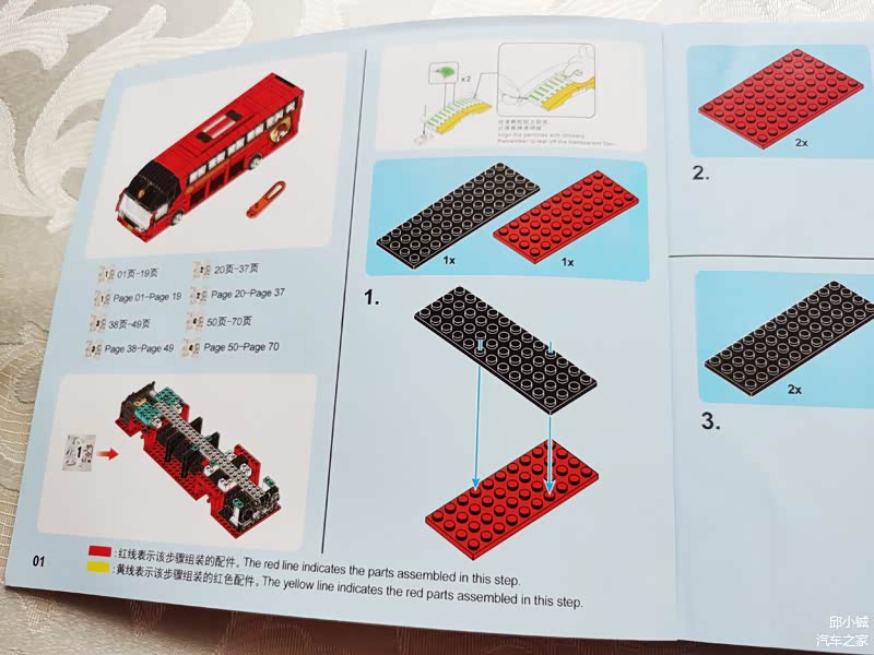 说明书的印刷精美,一共有70页,步骤介绍清晰。积木颗粒被分装在了有编号的透明塑封袋中,编号从1至4。这样的分类和乐高是一样的,玩家按顺序拼搭,可大大提高拼装效率。