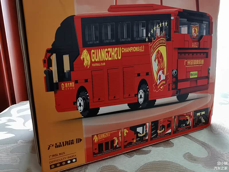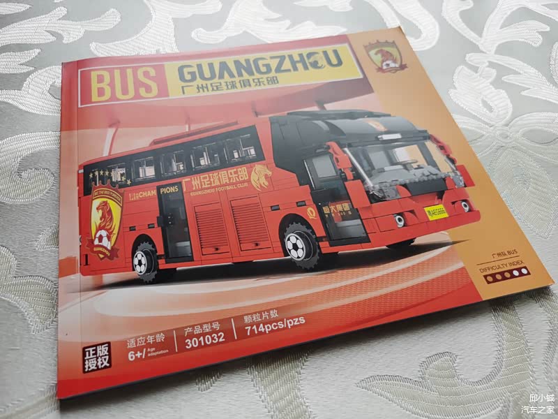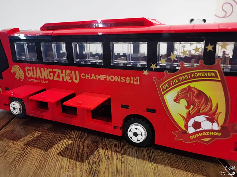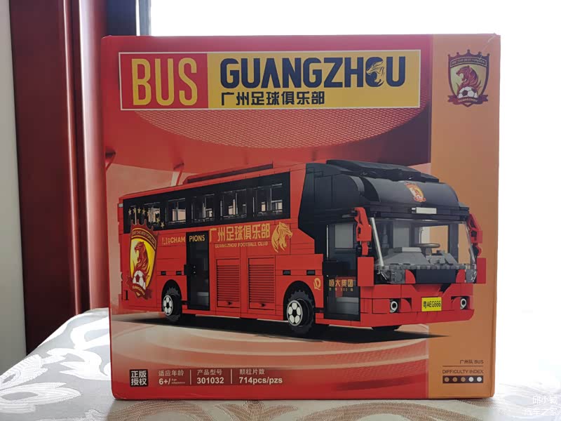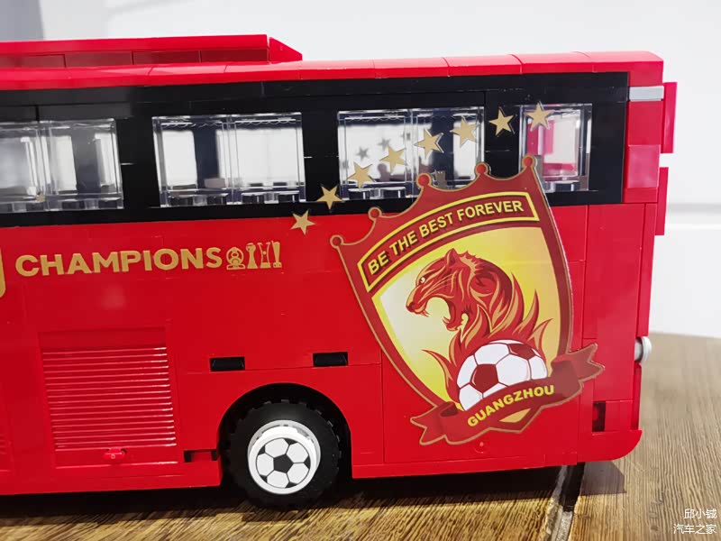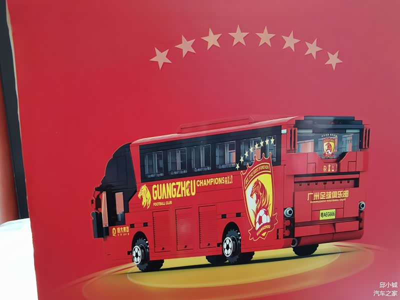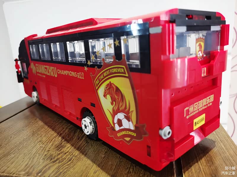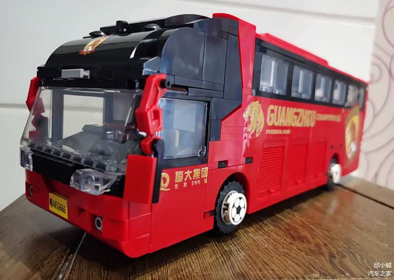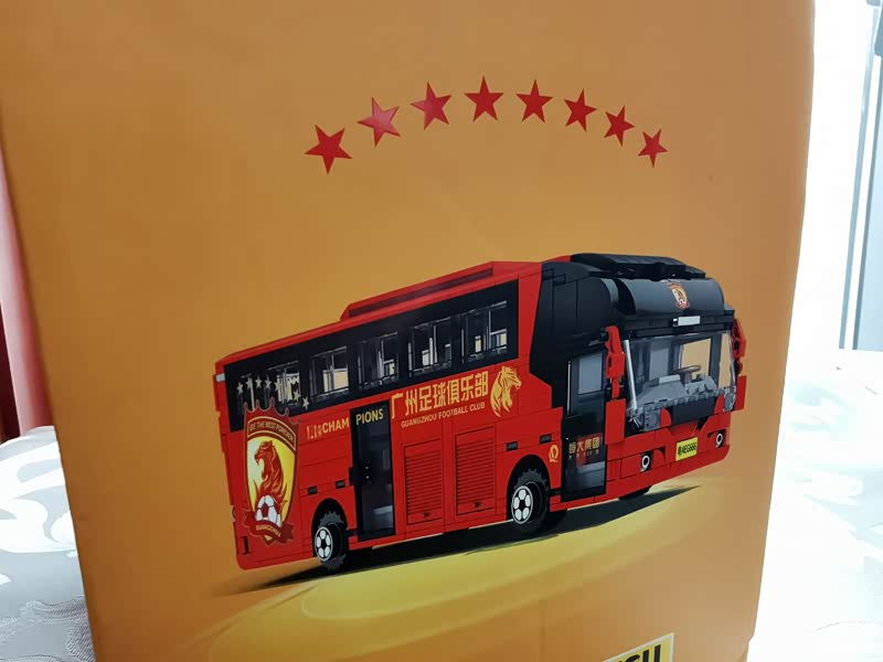 本期介绍的铖品是广州恒大足球俱乐部官方授权的球队巴士拼装积木,颗粒片数为714颗。红色的主色调,就是球迷们熟悉的那个“广州红”。
