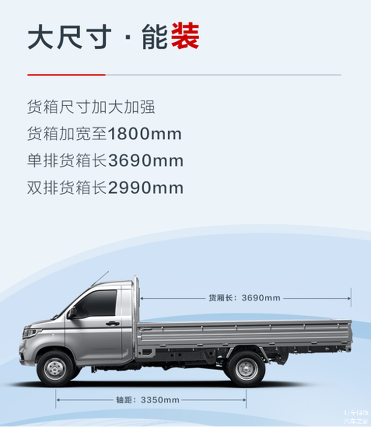 承载方面,汽油版单双排额定载质量分别为1,694公斤和1,475公斤,CNG版为1,555公斤和1,335公斤。新车优化了货箱结构,标配龙门架,货箱边板额外增加厢板支撑板固定。货箱品质也进行了升级,采用辊压工艺,刚度提升16%,货箱前端与车架横梁采用螺栓连接。新车还采用了加强型方管结构及5+2主副簧钢板弹簧,一定程度上可兼顾舒适与承载。
