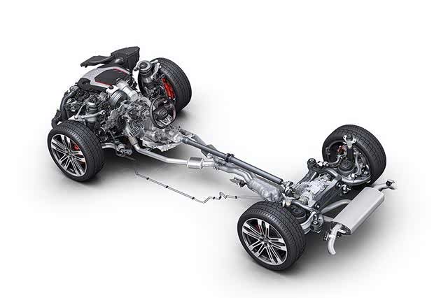 奥迪的quattro系统是一种全时四驱系统,它采用了托森C型或托森D型(冠状差速器)作为中央差速器,可以实现前后轴的动力分配和转速差的消化。quattro系统的中央差速器还具有自锁功能,当前后轴有较大的转速差时,可以通过摩擦片或行星齿轮的相对运动,产生一定的锁止效果,从而增加四驱系统的牵引力和稳定性。quattro系统还配备了运动性差速器或扭矩矢量分配系统,可以实现后轴左右轮的动力分配和转速差的消化,从而提高四驱系统的灵敏性和操控性。quattro系统的特点是先进、强悍、多样,适合高性能和越野性的追求。