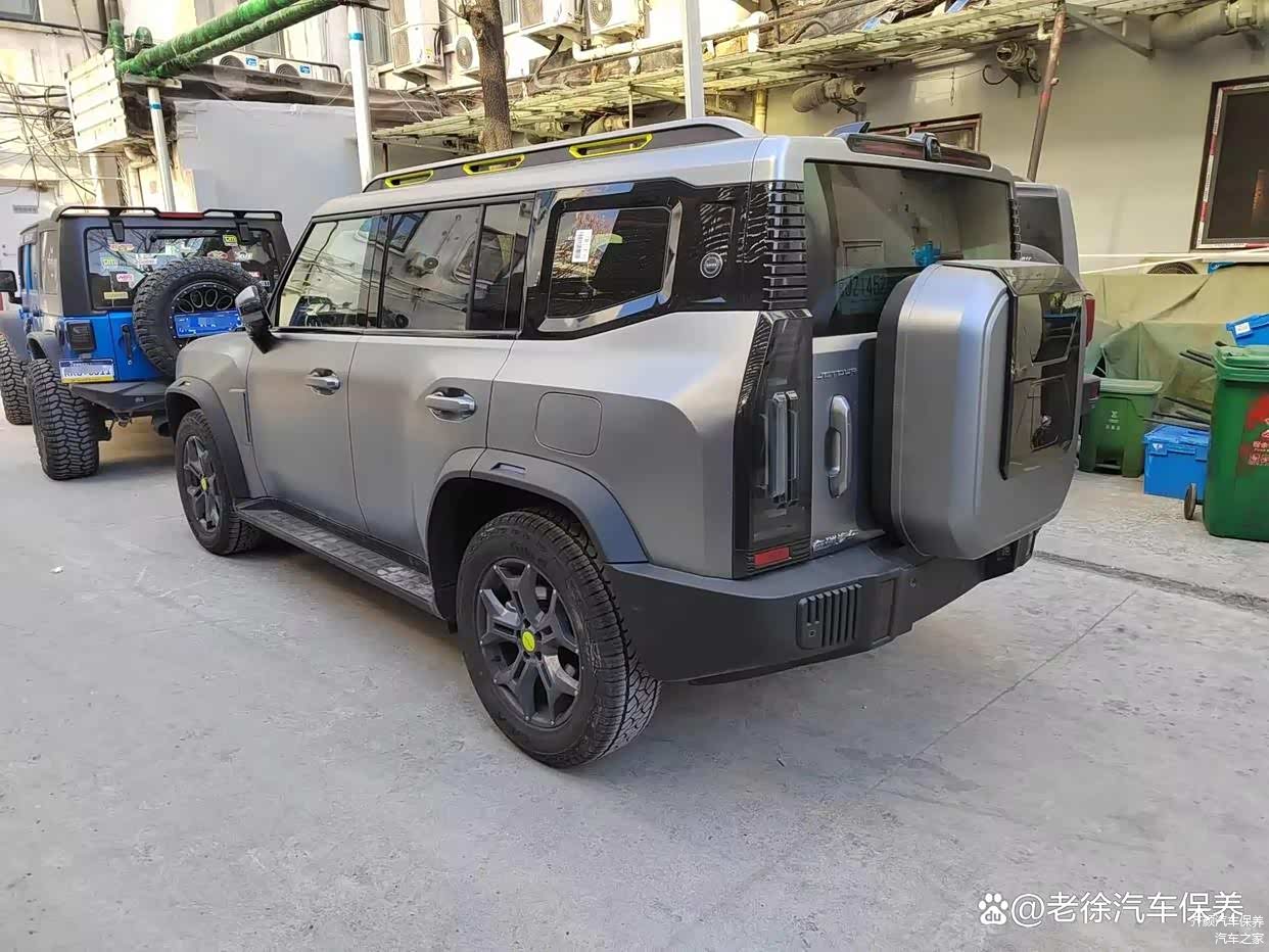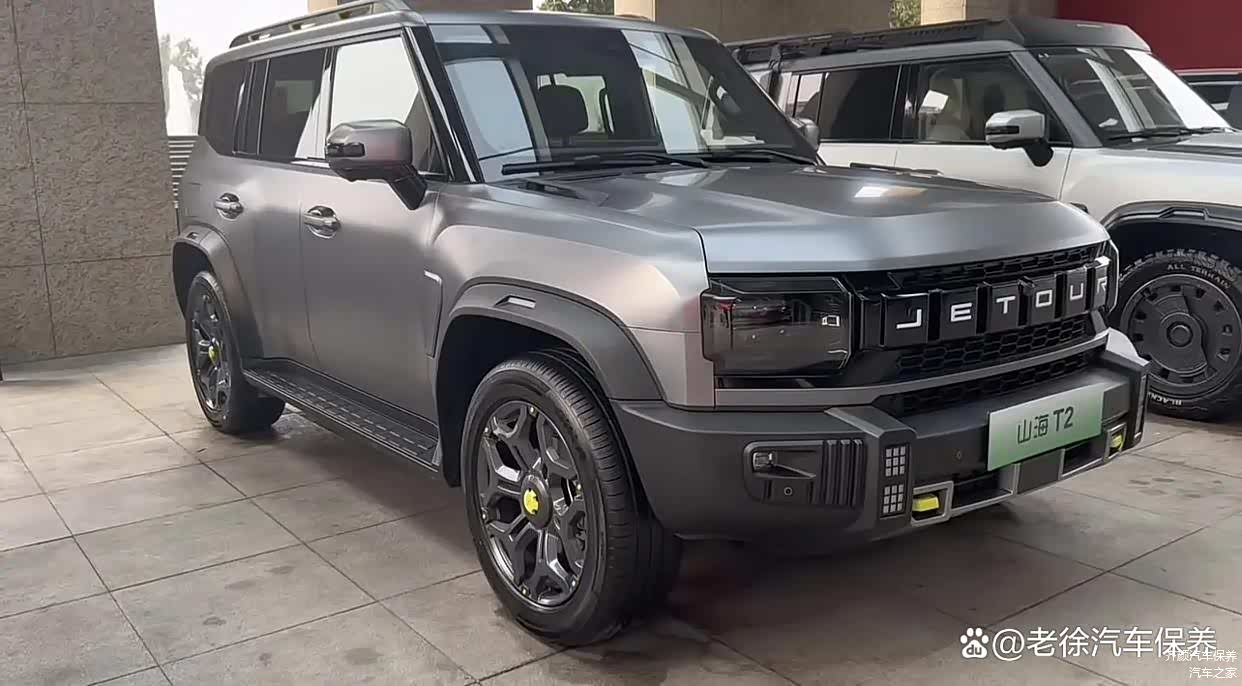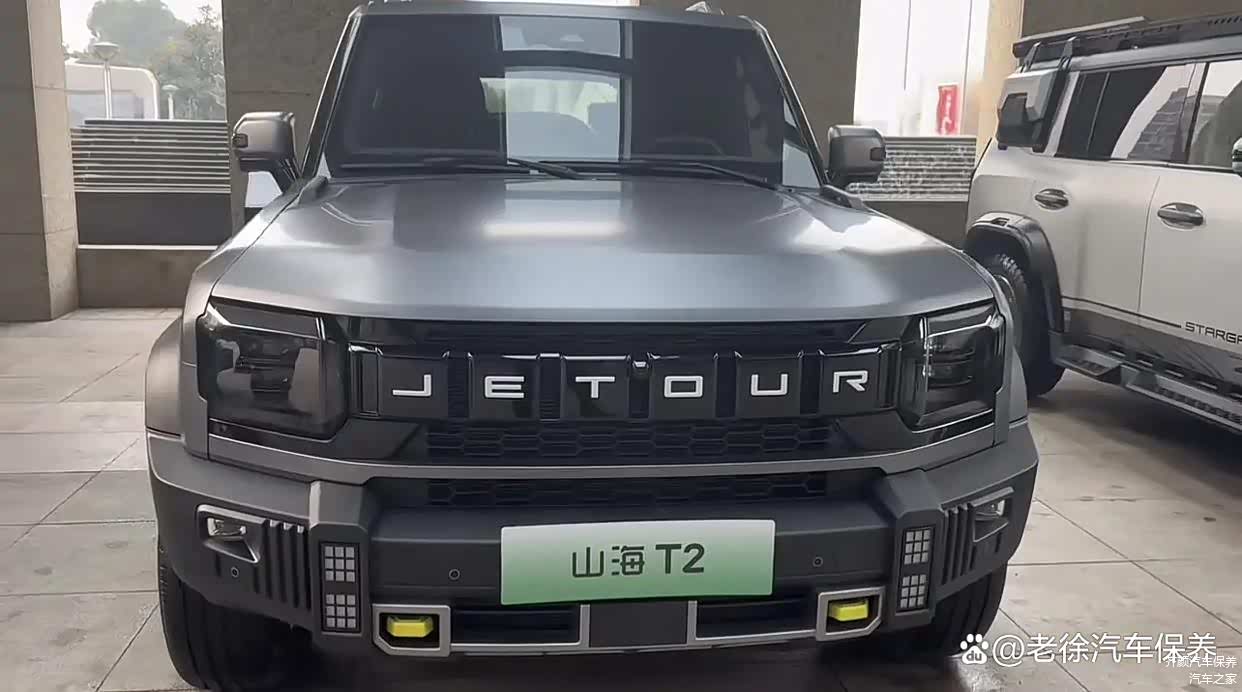 在外观设计上,山海T2秉承了捷途旅行者的硬派越野风格,并巧妙融入了现代科技元素。车辆前端的矩形熏黑进气格栅与两侧方形大灯融为一体,内部镶嵌有发光的“JETOUR”标识,古典与现代交织,独具韵味。而亮眼的黄色拖车钩和四颗辅助照明灯,则为车辆增添了一丝赛博朋克的科幻感。车身尺寸的增大、“方盒子”造型的采用,以及悬浮式车顶和撞色行李架等细节设计,既强调了山海T2硬朗的气质,又为其注入了时尚与前卫的基因。