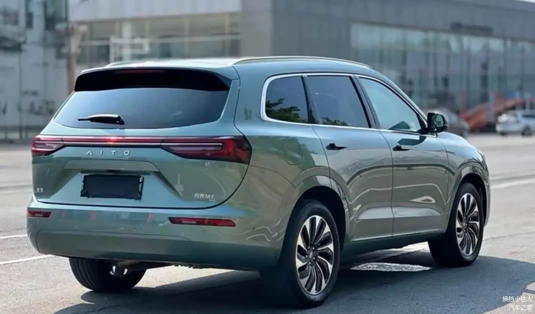 问界M7的外观设计的简洁大方,车头的造型得体,前大灯组设计的圆润修长,中间还装饰了一条灯带,营造出贯穿式前大灯组的既视感,进气格栅的造型宽大,中网上装饰了横向的线条来提升层次感,前包围处理的较为厚实。车身的造型扎实修长,车窗的周边装饰了镀铬饰条,腰线勾勒的突出有力,和下裙位置的筋线相呼应,多幅式轮毂的造型得体。车尾的样式高耸,尾灯组采用的是贯穿式的设计,灯罩进行了熏黑的处理,下方还装饰了字母标识。