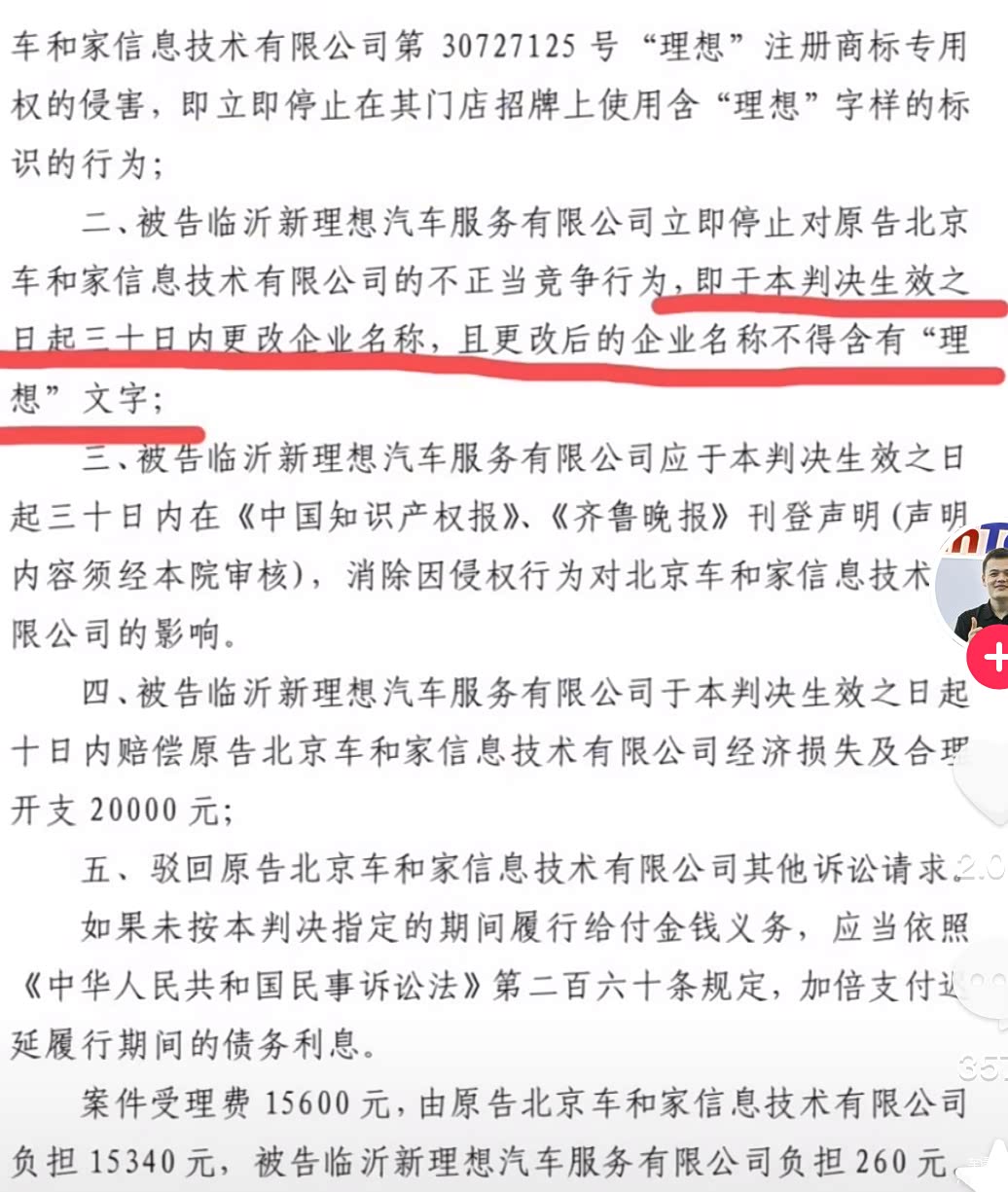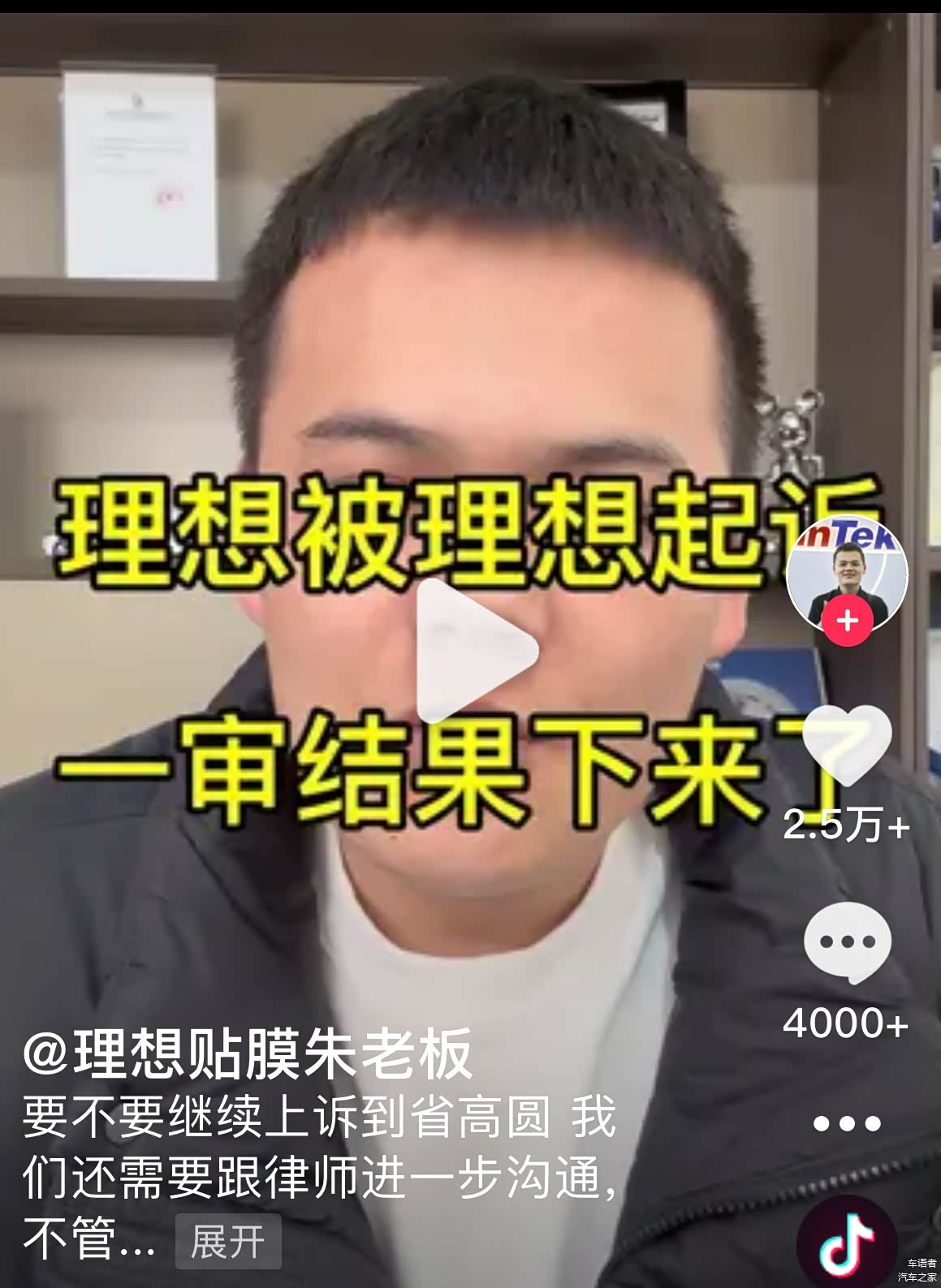 2024年3月27日下午,注册名为“理想贴膜朱老板”的ID发布短视频,称去年北京车和家信息技术有限公司诉他的贴膜店侵害商标权及不正当竞争一案,经山东临沂市中级人民法院审理,第一审判决出来了。