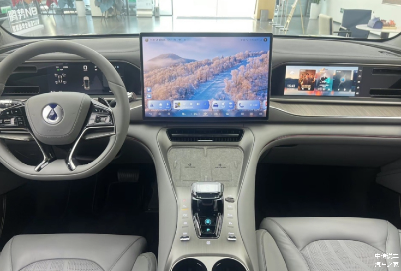 进入车内,新款腾势N7同样带来了不小的惊喜。新车配备了全液晶仪表、悬浮式中控屏以及副驾驶娱乐屏组成的三屏联动系统,加上50英寸AR-HUD、128色氛围灯以及新增的流媒体后视镜等配置,使得车内科技氛围十分浓郁。同时,大量真皮与麂皮包裹的内饰铺陈,也进一步提升了车内的豪华感。