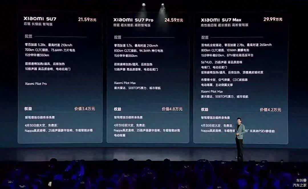 2024年3月28日,今年最重磅的新车 小米SU7(图片 | 参数 | 询价)(正确读音是连读“苏”音)终于公布了售价,21.59万-29.99万元的定价符合你的预期吗?毕竟它的车长4997mm、轴距3000mm、风阻系数只有0.195Cd、零百加速最快2.78s、最长续航830km...雷总说智能和生态,是小米汽车最大的优势。确实如此,毕竟我刚刚看了将近2小时的配件“展销会”...(别的先不说,小米SU7的SKU要炸了!)