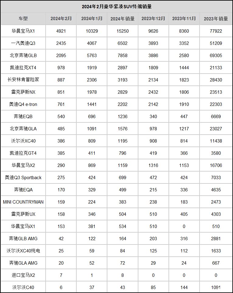 豪华紧凑型SUV是离普通工薪家庭很近的豪华车,相比豪华紧凑轿车,它空间更大、实用性更好。在这个细分市场,华晨宝马X1是销量领跑者,虽然有低端车型采用三缸发动机的短板,在低价格面前,这个缺点可以被忽视。在2024年2月,华晨宝马X1的月终端销量为4921辆,前两个月总销量15250辆。国产宝马X2的2月销量为290辆,前两个月总销量1159辆,它将逐渐退市。全新一代进口X2的2月销量为7辆,前两个月总销量为8辆。纯电动车型方面,因为尚未开启大幅降价冲量模式,国产宝马iX1的业绩表现一般,2月终端销量只有153辆,前两个月总销量为534辆。