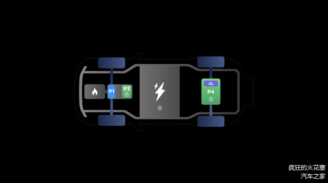 DMO的电动四驱相比于传统的机械四驱,并没有中央传动轴,而是利用P3和P4电机分别驱动前后轮,这种双电机的四驱布局形式,可以通过电控系统轻松实现“电能分动”,再加上电机直驱可以瞬间获得最大扭矩,让DMO相比于传统四驱拥有非常明显的优势