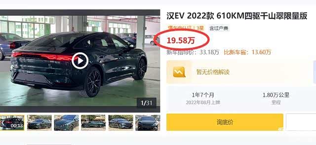 连锁反应,新车价格暴跌,自然直接让这台车在二手车市场暴跌,开了2年不到,1.8万多公里的比亚迪汉ev千山翠,610km四驱款,二手只能跌到19.58万元,相当于两年巨亏达到了14万多,如此惊天的贬值率,就算是宝马5系豪车也不至于如此。