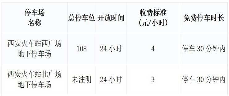 西安火车站北广场地下停车场:30分钟内免费停车,超过30分钟后每小时收费3元,停车场24小时开放。