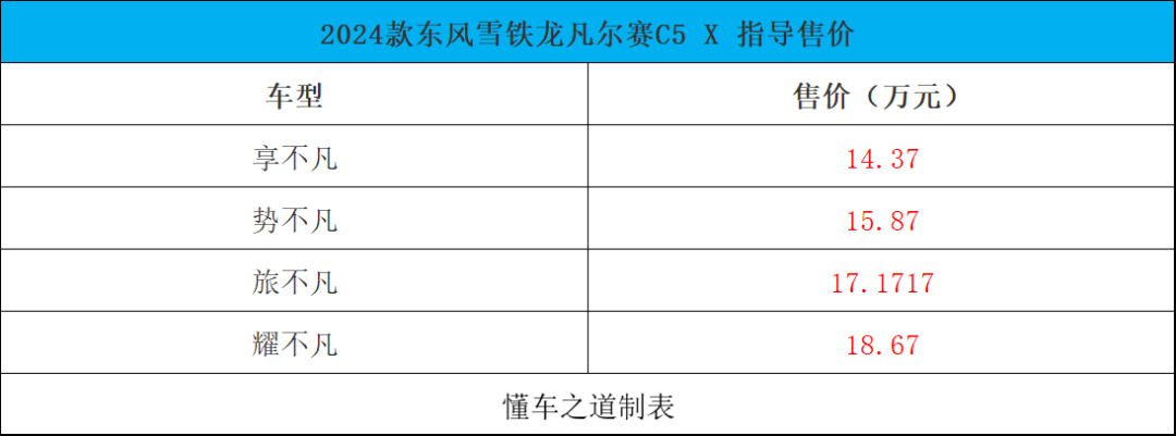 【懂车之道 产品】近日,懂车之道获悉,2024款 凡尔赛C5 X(图片 | 参数 | 询价)正式发布上市,共推4款车型,售价14.37-18.67万元。新车此次在外观与内饰等方面增加22项升级。新车定位为一款中型车,融合轿车、SUV、旅行车形态。
