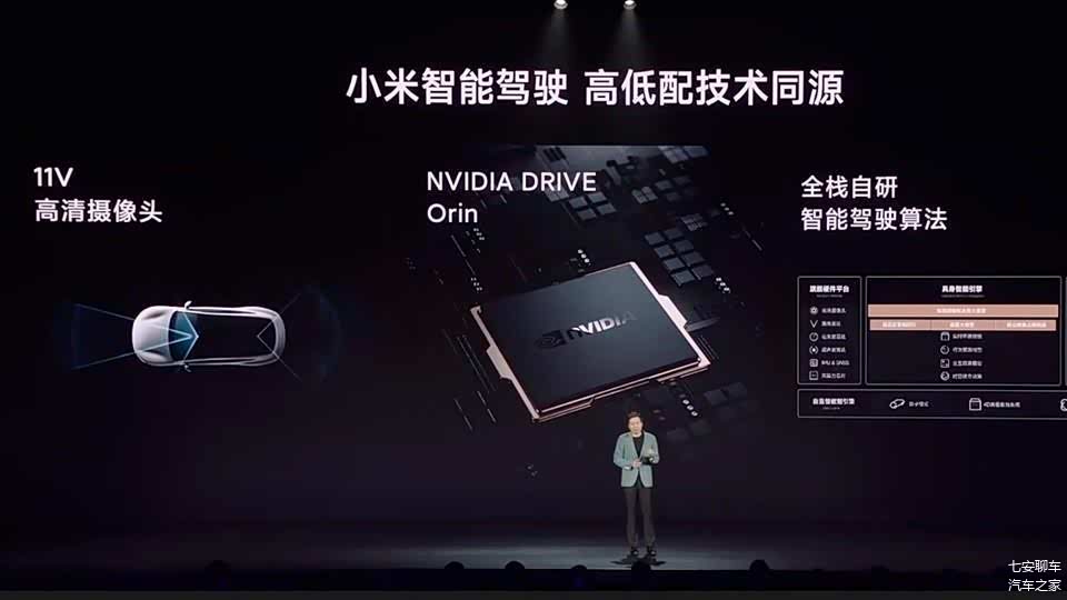 我们来看看 小米SU7(图片 | 参数 | 询价)都搭载了哪些智能驾驶硬件。它采用了英伟达Orin X芯片作为算力芯片,入门版单芯片算力84 TOPS,高配双芯片加上1颗激光雷达、2颗毫米波雷达,总算力高达508 TOPS。而且无论入门还是高配,都标配11颗高清摄像头、12颗超声波雷达,感知配置相当不错。