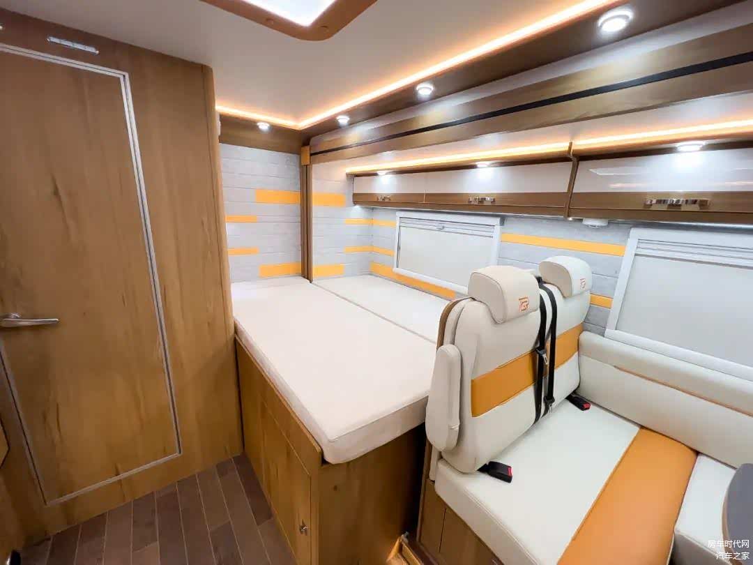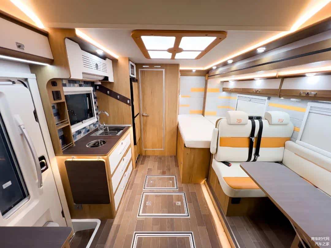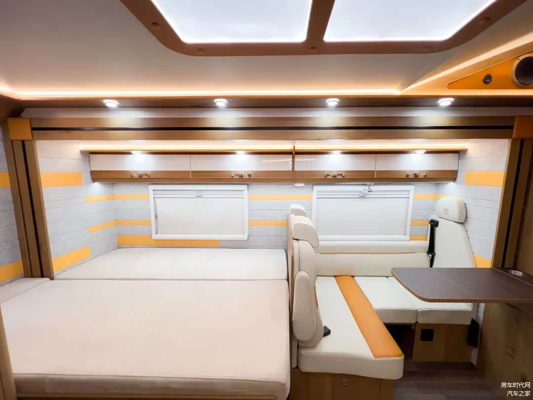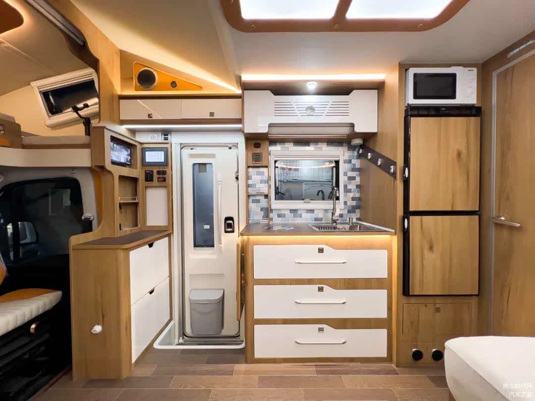 车厢内部设置了丰富的储物空间,包括有沙发区吊柜、后床区吊柜、厨房区吊柜、冰箱组合柜、组合厨柜,豪华高光+轻质板材质感十足,强大的储物空间设计让车辆能够满足一大家旅居储物的需求。