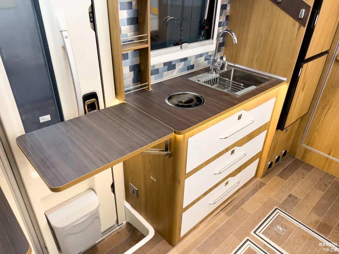 厨房区位于中门两侧,旁侧设计有拓展桌板,可进一步增加厨台的操作面积,便于用户制餐。台面内嵌有电磁炉以及厨房水槽+多功能冷热水龙头,上方隐藏有一台行车空调,下方为三层储物抽屉,区域内还为用户配置了一台弗罗斯特148L车载冰箱以及220V房车专用微波炉,让用户旅居更为便捷舒适。