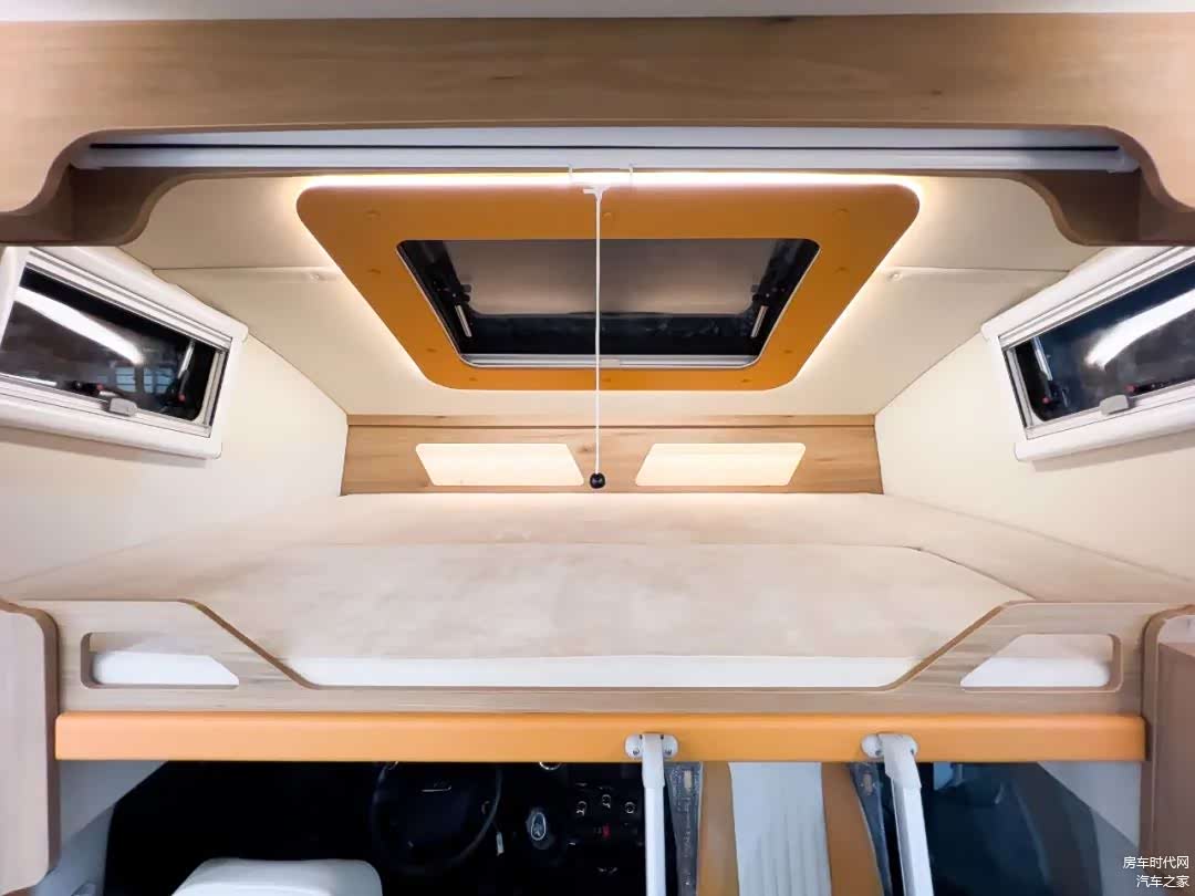 驾驶室上方的额头床尺寸为2200×1350mm,周围配置有对流窗以及天窗,整体呈现更为通透的车内空间。娱乐功能方面,车内配备60寸幕布+投影仪+音响组合设施,展开幕布后可在会客区卡座和后置纵床上舒适观看。