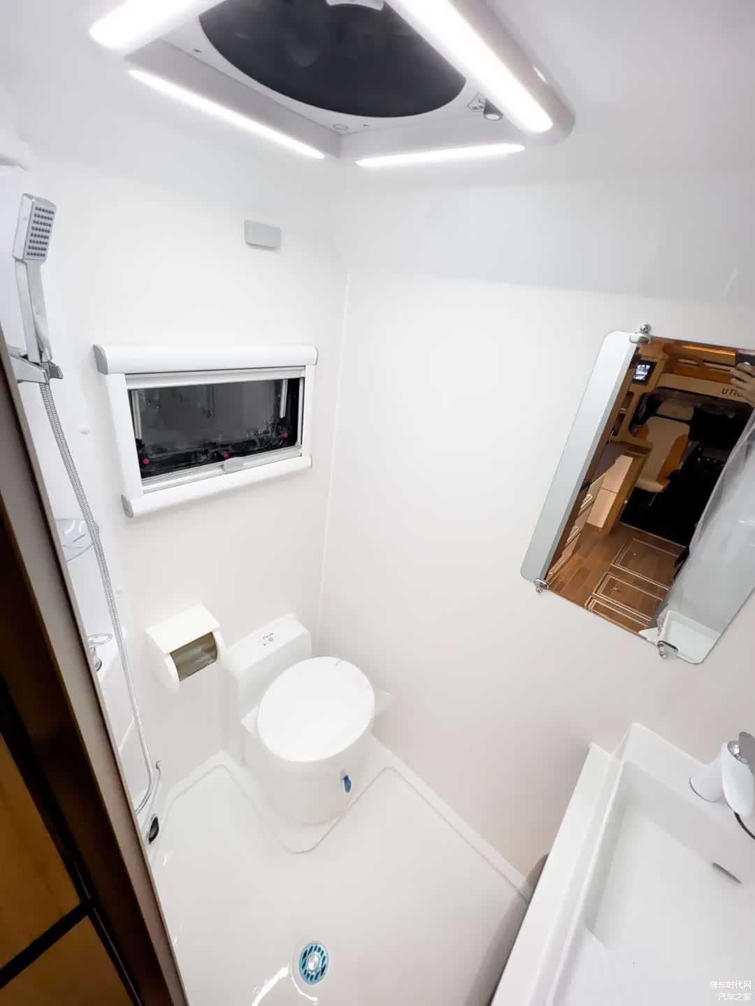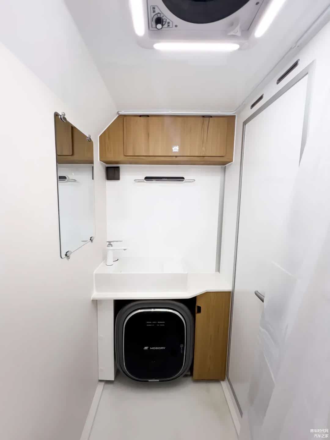 独立卫生间尺寸可达1400×900mm,内部配有双向换气扇、独立照明、独立固定水槽+花洒、梳妆镜(带镜灯)、抽拉式盒式马桶、折叠毛巾架、抽纸盒、储物柜(豪华高光+防水高光板)、牙刷杯、抽拉式晾衣绳等,卫浴设施丰富。此外,洗手池下方还内嵌了一台莫博3kg全自动滚筒洗衣机,让用户旅居更加便利。
