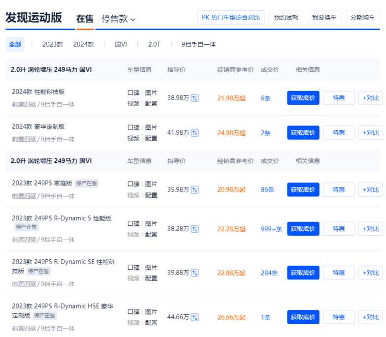 20万出头起售的发现运动版,价格是便宜了许多,相较于指导价,优惠高达15万(入门版),而顶配的优惠更是高达19.20万元。