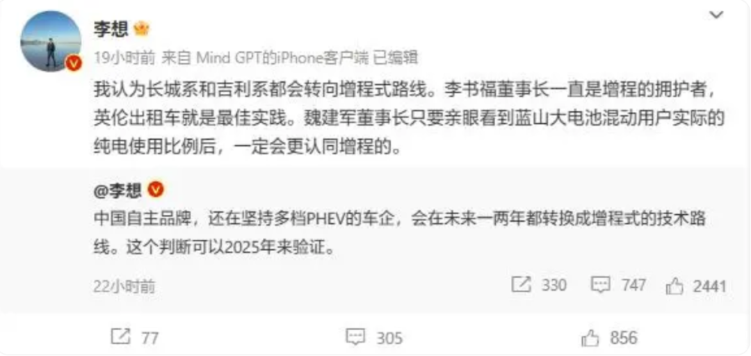 一直类似预言家的李想同学,每次都说得挺准,但在增程和多挡位插混这个问题上,则有可能会面临被“打脸”。