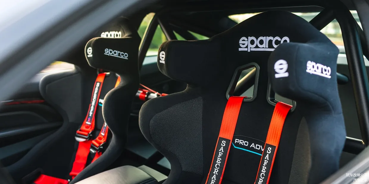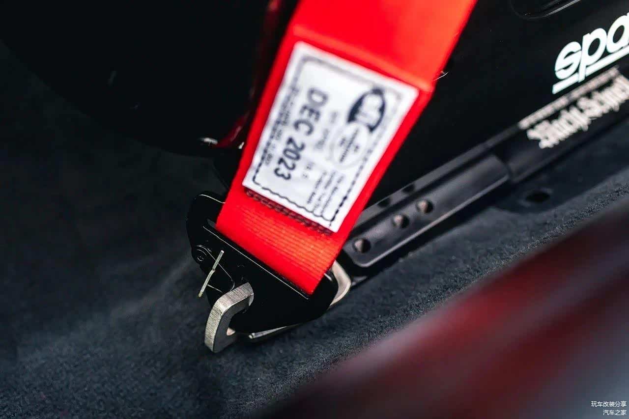 由于需要保持街道使用,所以内饰没有拆空,后排增加了防滚架,前排座椅使用Sparco Pro ADV赛车座椅,搭配红色Safecraft安全带。方向盘替换为KMP Drivetrain赛车方向盘,搭配碳纤维换挡拨片。为了获取更多赛道数据,增加了一套AiM Solo 2 DL圈速记录器和SmartyCam。