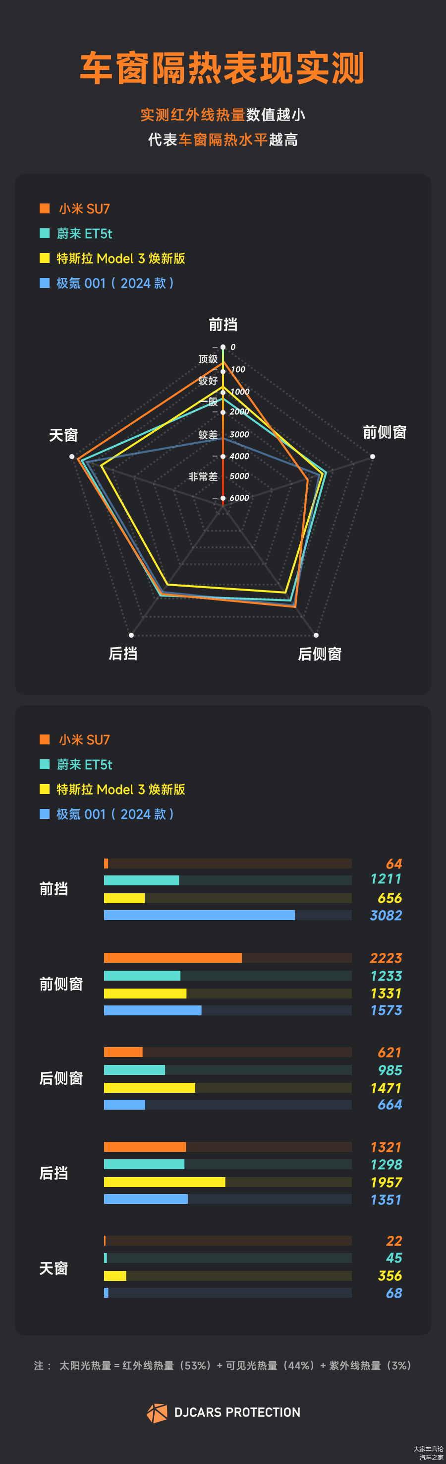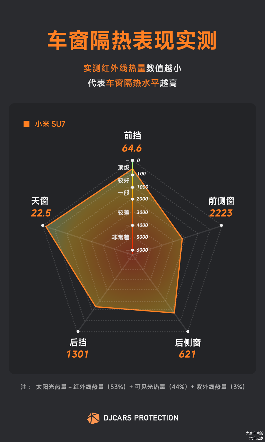 我们实测下来,小米SU7全车玻璃隔热表现为: