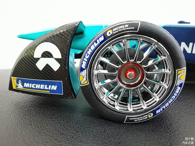 蔚来FE赛车采用的是米其林轮胎,在前侧翼、后尾翼和轮胎上,都可以看到相关的标识和LOGO。轮毂的造型非常闪亮,反而有了一种复古的风格。