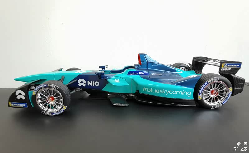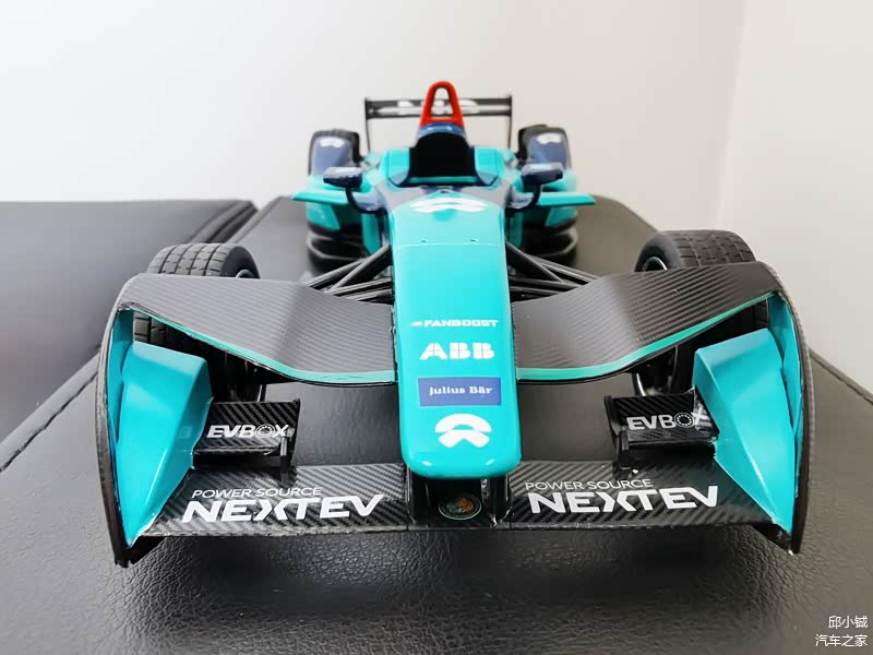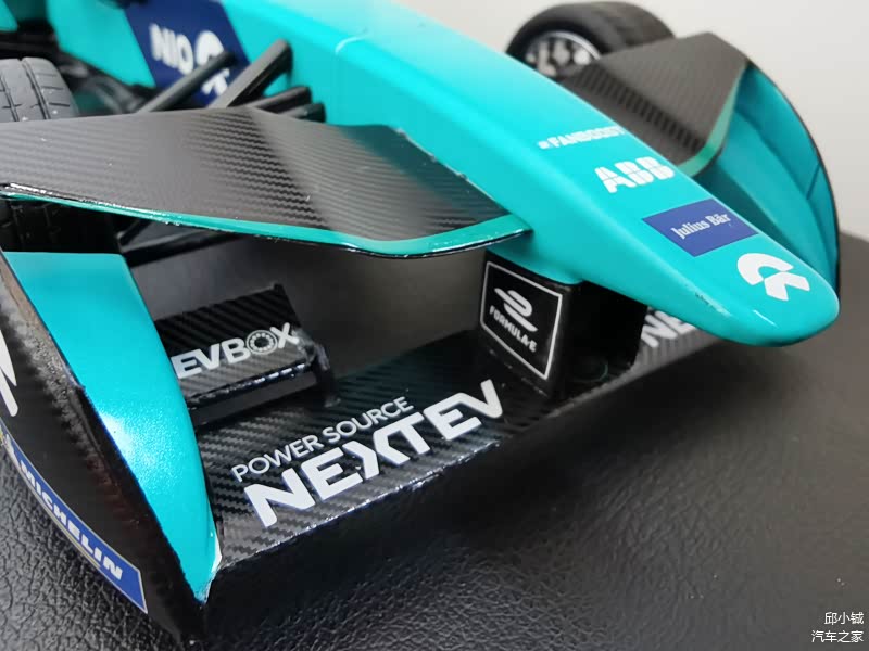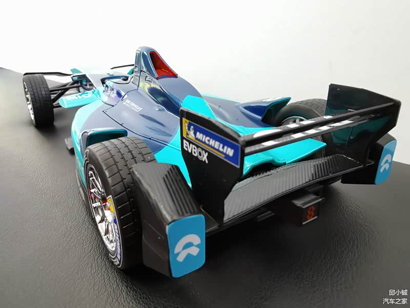 回头来看这款蔚来FE赛车,整体涂装是我们熟悉的湖蓝和深蓝拼色,就是最初蔚来汽车的风格。大量的碳纤维材质运用,可以大大降低车身重量。当然,汽车模型不会用上碳纤维,这是在情理之中的,毕竟成本摆在那儿,看到也只是碳纤维纹理的黑色涂装。
