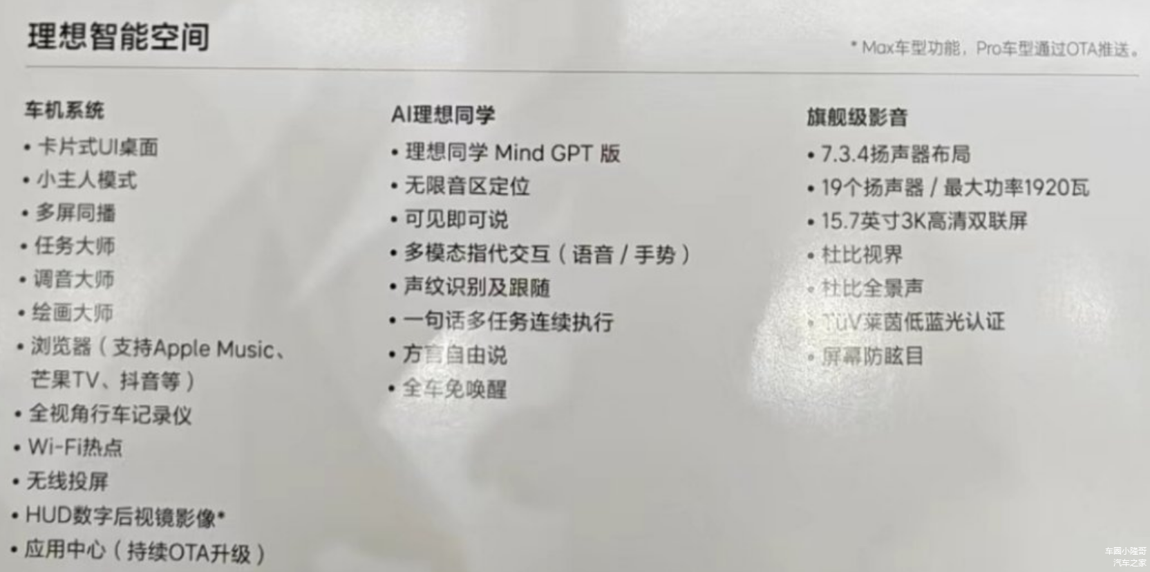 智能空间方面,配备了多种智能应用功能,同时应用中心支持升级,这些功能在理想其它车型也是具备的。