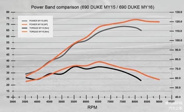除了缸盖极其内部的变化之外,LC4发动机的缸体部分也有了一些变化,缸径增加了3mm达到了105mm,冲程减少了4.5mm增加到了80mm,也就是我们现在看到的拥有693cc的LC4发动机,上一代LC4发动机排量仅有609cc。缸径的增加也让活塞头的体积有所增加,不过整个活塞的重量并没有变化;连接活塞的曲轴连杆也采用了轻量化的材料以减少转动惯性提高发动机的动力响应。通过这些方面的升级,LC4发动机的动力输出得到了提高,最大功率提升了7%达到了73马力,峰值扭矩提高了6%达到了73N·m。在提升动力性能的同时,KTM的工程师还对经济性和排放进行了升级,现在的690发动机已经满足了欧4排放标准。