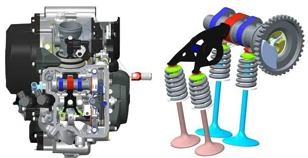 先来说说这台代号为LC4的单杠大排量发动机,这台LC4发动机看起来和上一代发动机看起来只有一些细微的差别,但根据KTM方面的消息表示新款引擎上并没有多少零部件可以和老款共用。LC4发动机最大的变化就集中在了缸盖部分,已经从上一代发动机的SOHC升级成了DOHC,同时正时链条会连接两个齿轮,但其中只有一个齿轮才真的带动凸轮轴。原本的单凸轮轴被移植到了进气门一侧,并且通过增加的结构可以同时控制排气门的开闭,而排气门一侧增加的轴可以看做是平衡轴,为减少发动机的震动做出了不少的帮助。此外缸盖的材料也从铝合金材料换成了更轻的镁合金材料,并且整个缸盖只用了三个螺栓进行固定,减少的重量非常可观。
