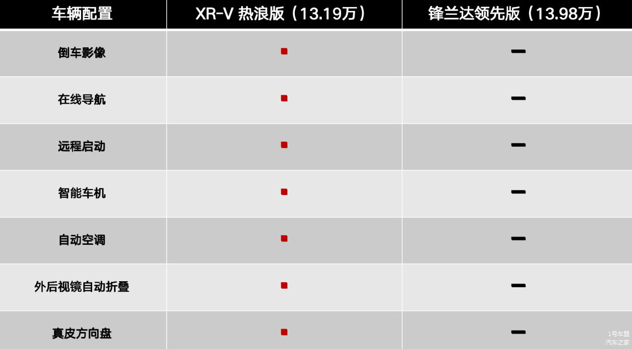 再来看看两款车的主销版本,在配置上,XR-V 热浪版(官方指导价13.19万元)对比锋兰达领先版(官方指导价13.98万元)不仅毫不逊色,甚至还给予了消费者更高一级的用车体验。