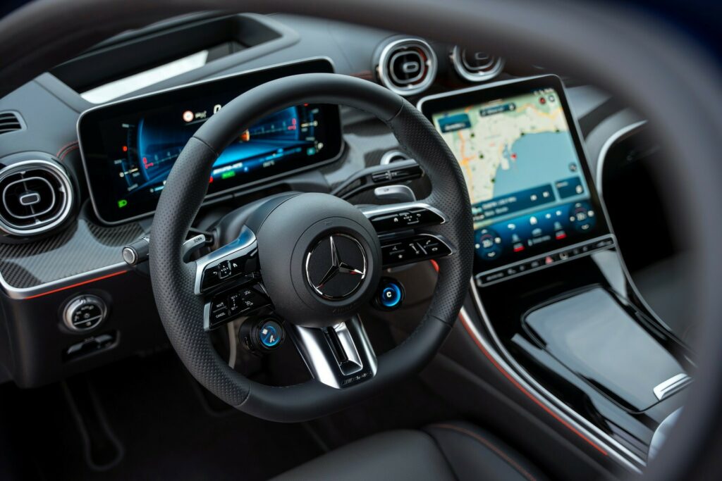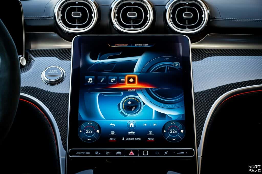 内饰方面,配备了MB-Tex和超细纤维内饰的AMG运动座椅,同时提供AMG Performance座椅和Nappa座椅材质可供选配。配备了AMG Performance方向盘,12.3英寸的数字仪表盘以及11.9英寸的触控式中控屏,大大提升了座舱内的科技氛围。除此之外,还配备了全景玻璃天窗,64色环境照明系统,拥有流媒体音乐功能的Burmester 3D环绕音响系统。不过,只有顶配车型才配备抬头显示(HUD)功能,以及增强现实导航功能。同时面对所有车型,提供了Pinnacle装饰选配,选配之后可以将头灯升级为带投影功能的数字头灯。值得一提的小亮点是,2024款AMG C 63 S引擎盖上的徽章并不是奔驰,而是AMG。