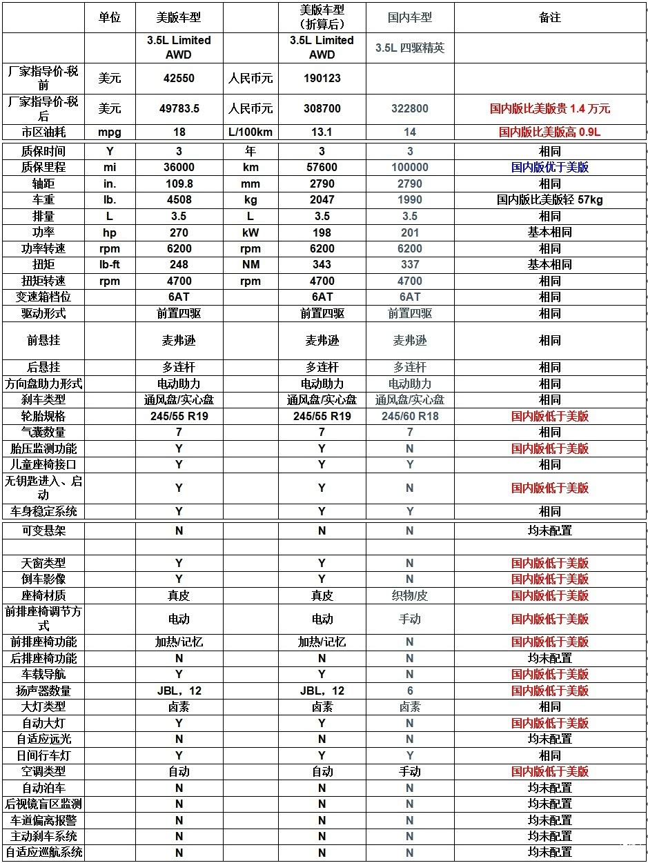 美版3.5L Limited AWD型与国内3.5L四驱精英型的比较见下表: