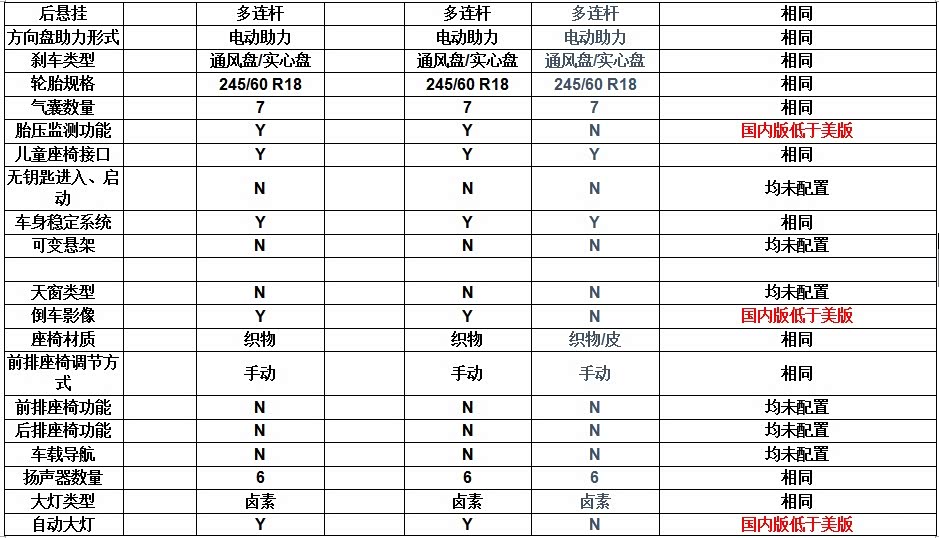 国内版低于美版的配置:价格、胎压监测、倒车影像、自动大灯。