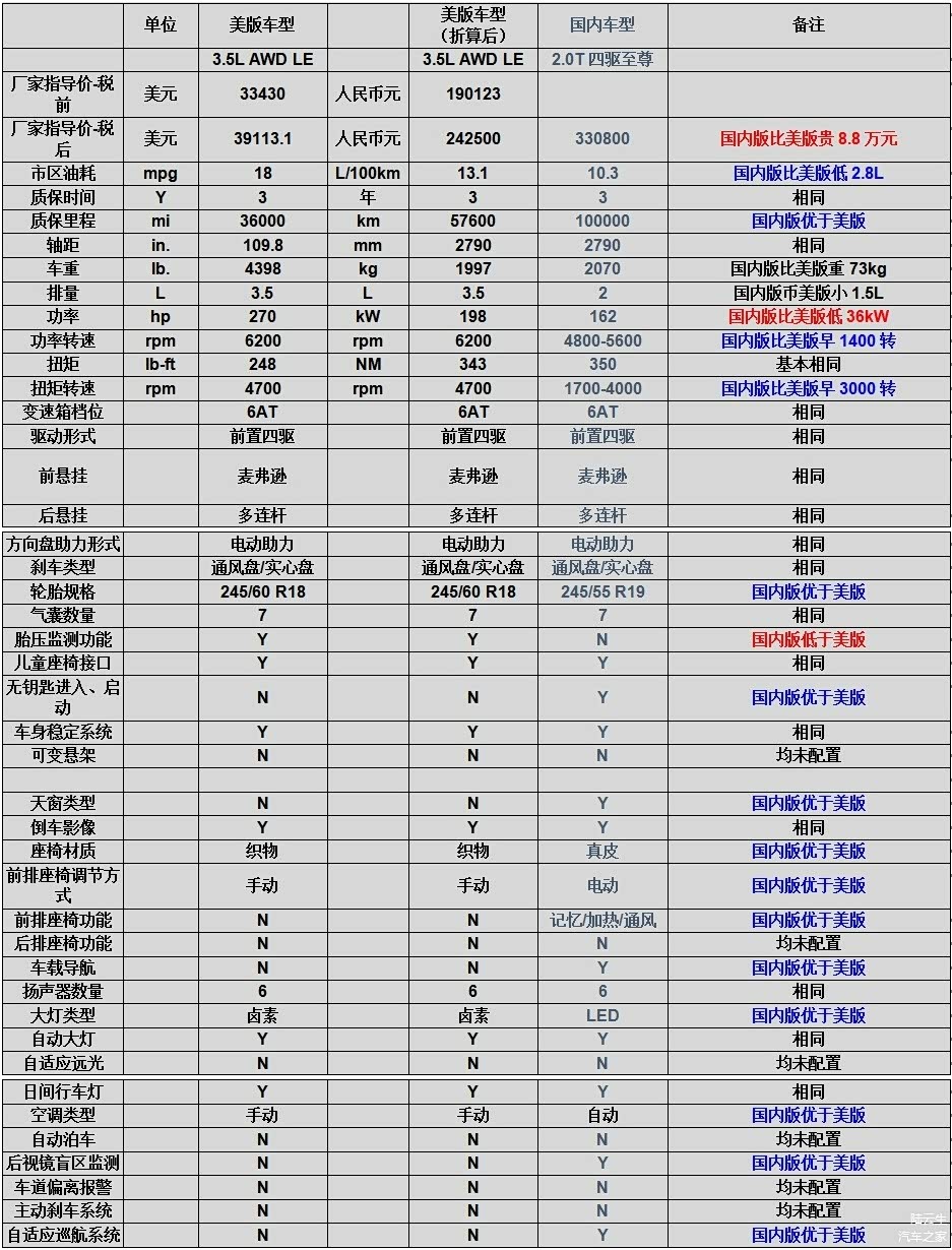 美版3.5L AWD LE型与国内2.0T四驱至尊型参数对比见下表: