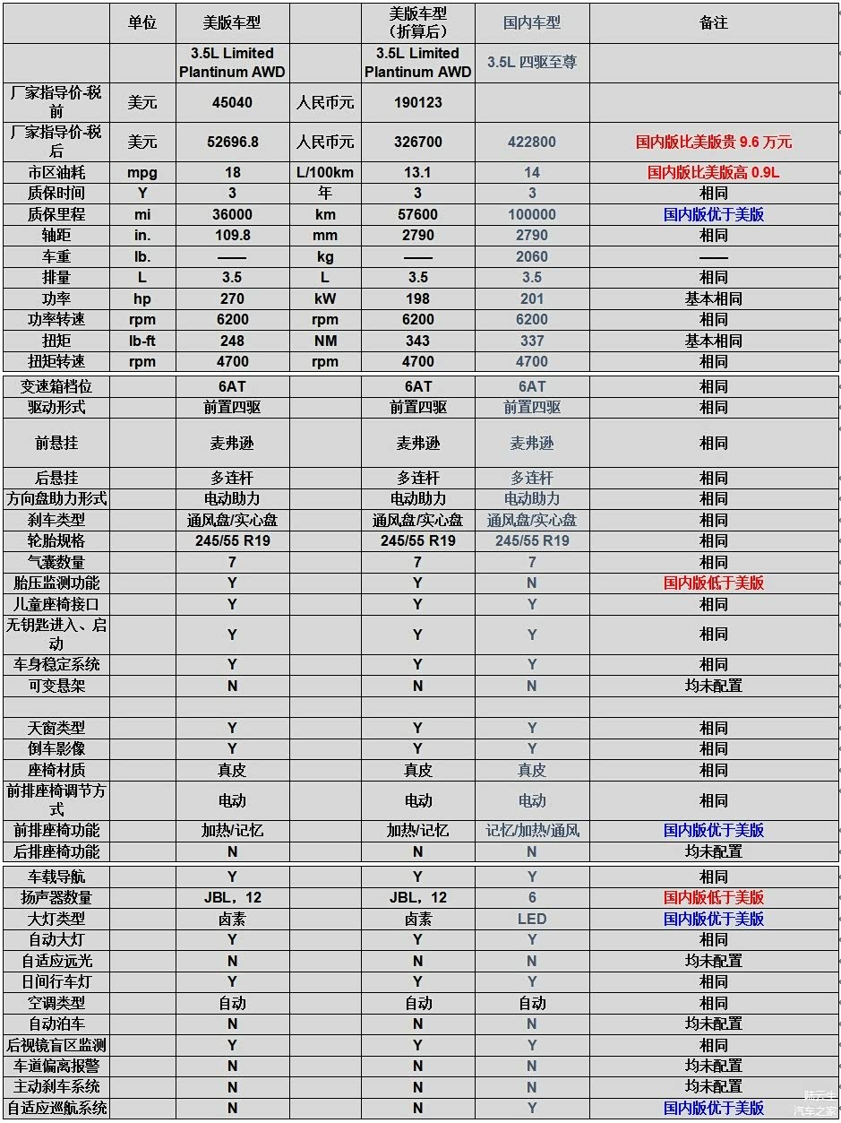 美版3.5L Limited Plantinum AWD型与国内3.5L四驱至尊型的比较见下表: