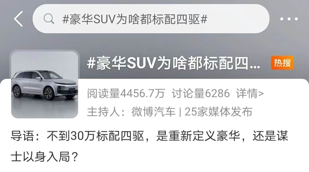昨天小编在刷微博时,有条莫名其妙的热搜 #豪华SUV为啥都标配四驱#,点击进去是关于理想L6的话题,加上理想L6的宣传片里也在大篇幅地吹捧四驱系统,我对此嗤之以鼻,“一个四驱也能当核心卖点啦?”,直到晚上公布价格的时候,厂长,我悟了。