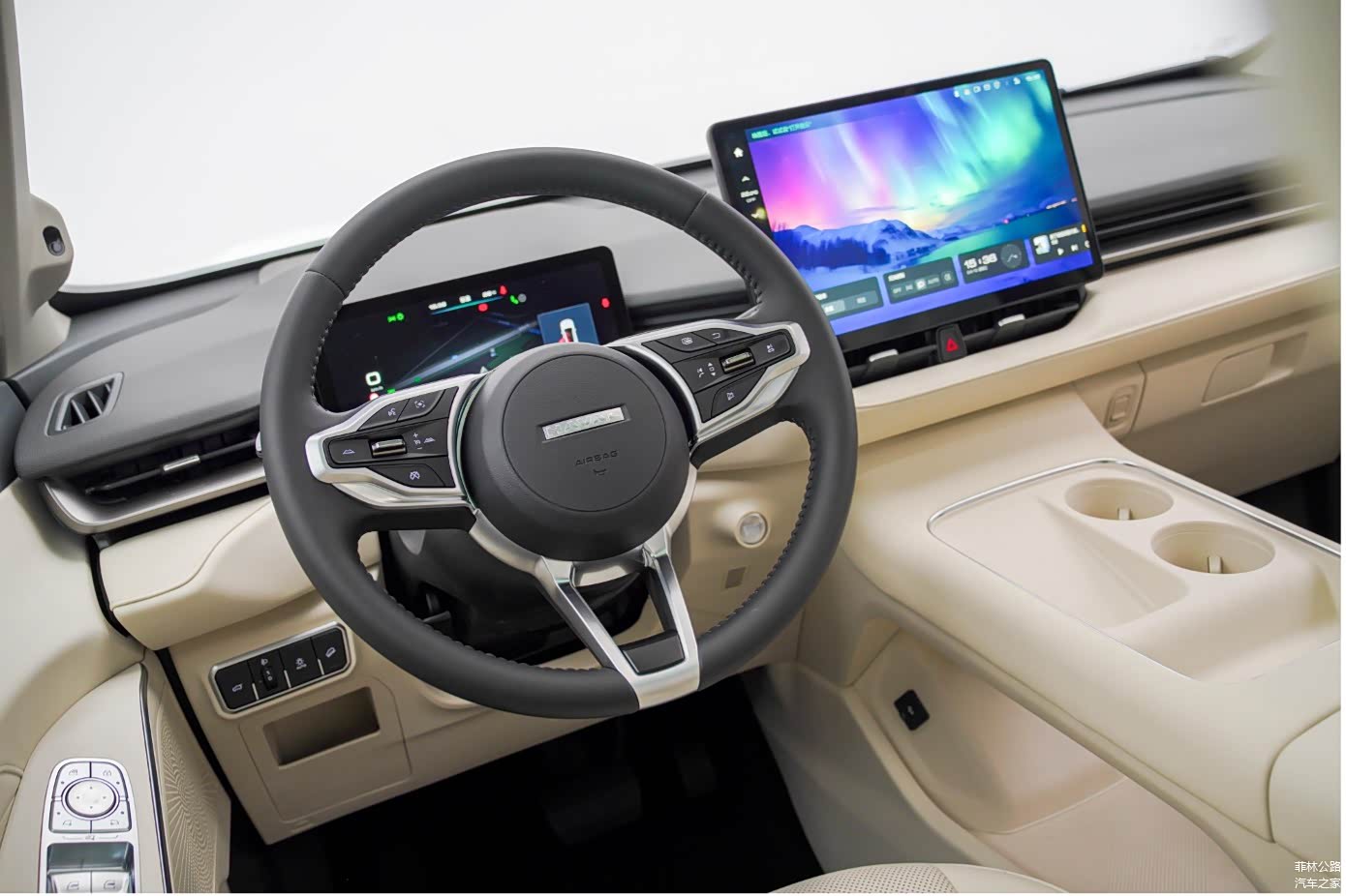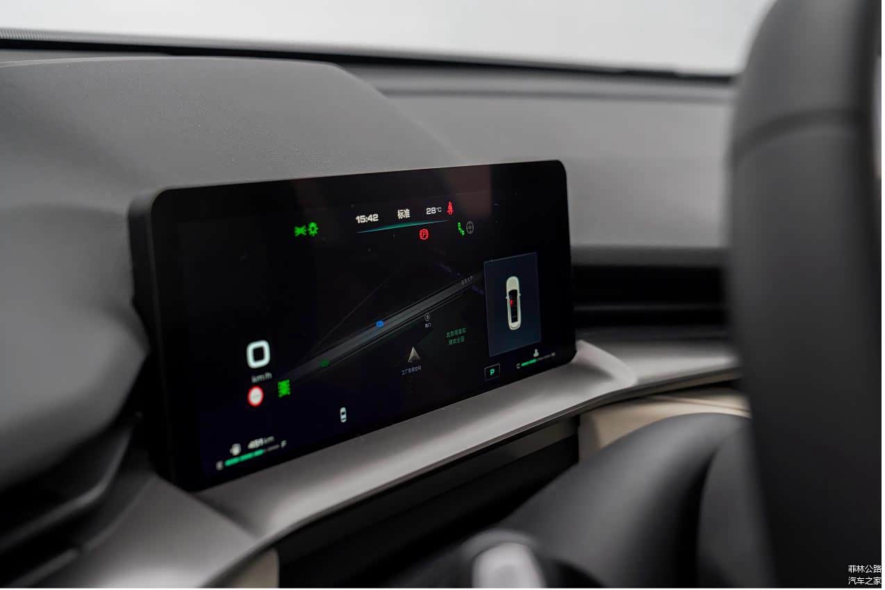 实拍车为纯净米色内饰,整体给人新中式极简风的感觉,前方中控台采用10.25寸数字仪表+14.6寸中控仪表屏的组合,科技感十足。
