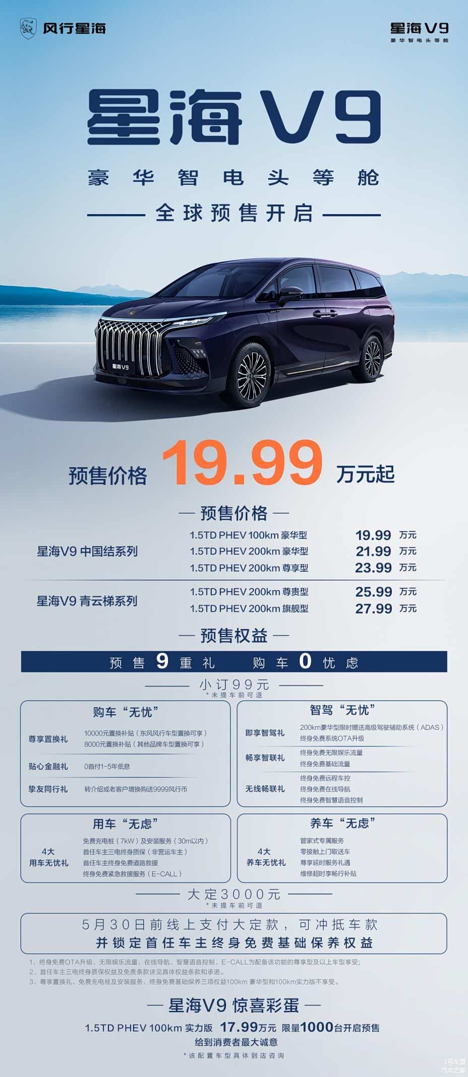 同时,风行星海V9也为下订车主准备了豪华的“预售9重礼”大礼包。预售期即刻交付99元定金,即可享受包括【尊享置换礼】东风风行老车主置换享10000元置换补贴,其他品牌车型置换可享8000元置换补贴;【贴心金融礼】0首付1-5年低息,更有【挚友同行礼】、【即享智驾礼】、【畅享智联礼】、【无线畅联礼】等至诚至意的购车政策,保障准车主们购车无忧、智驾无忧、用车无虑、养车无虑。5月30日前线上支付3000元大定款,可冲抵车款,并锁定首任车主终身免费基础保养权益,让用户轻松享受购车的高品质体验与服务。值得一提的是,东风风行还给用户带来惊喜彩蛋,限量预售1000台1.5TD PHEV 100km实力版车型,预售价只需17.99万元,给到消费者最大的诚意(该配置车型详情请到店咨询)。