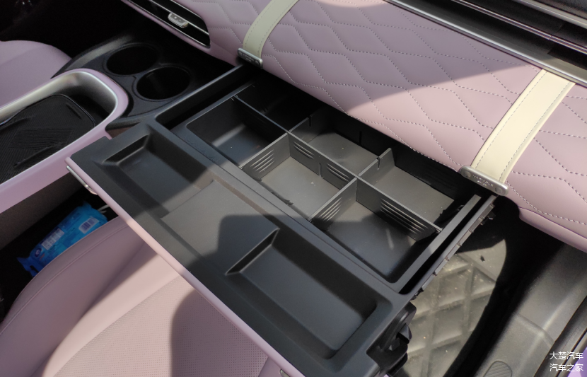 中控台配备了一块12.8英寸的智能中控屏,汇聚了丰富的车机影音功能,最值得一提的是,副驾驶前方独具匠心地设计了一个抽屉式梳妆台,轻松一拉即可变身为化妆台或办公桌,收放自如,随时满足您的需求。而在中央扶手之间,更是配备了同级唯一的50W无线快充设备,实现随充随用的便捷体验。