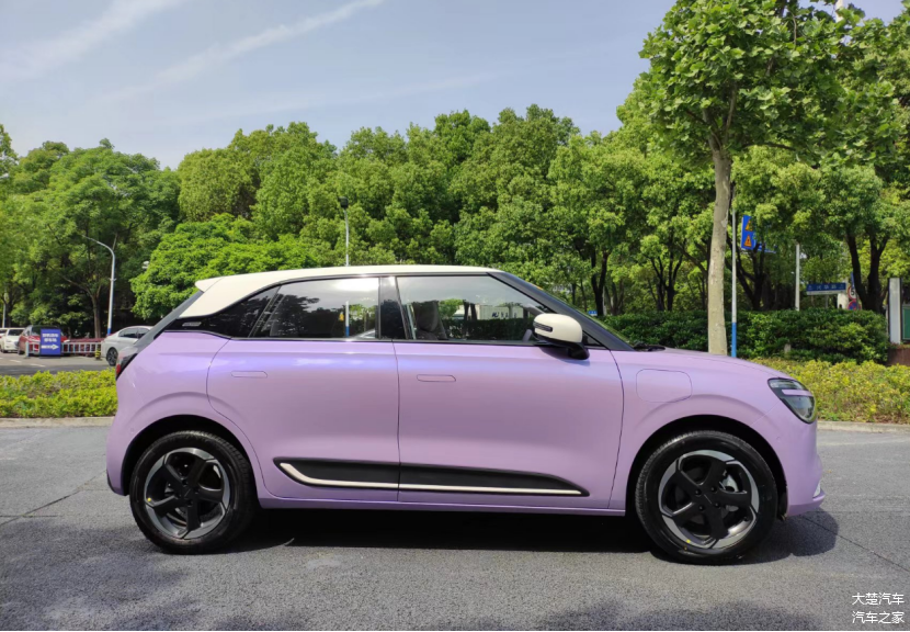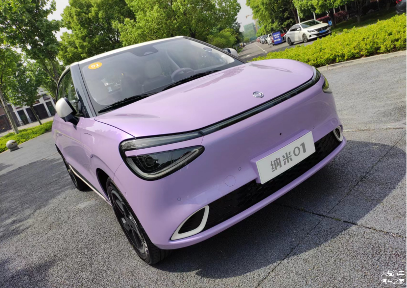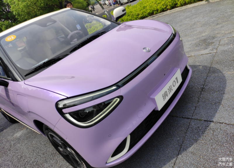 这次试驾是最新加推的幻想紫车型,纳米01的前脸部分,圆润的轮廓搭配两侧独特的“双C”内扣大灯设计,显得既时尚又充满科技感。下方的黑色棱形中网保险杠巧妙地与水滴状白色装饰相结合,使得整个前脸既精致典雅又不失现代感。