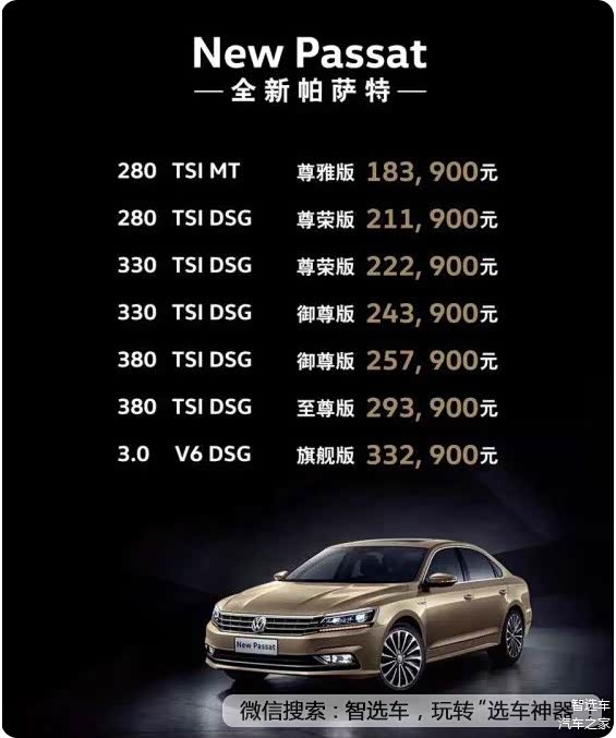今晚,全新帕萨特于南京正式上市,提供280TSI、330TSI、380TSI、3.0V6四款动力选择,匹配五速手动、DSG七速双离合及DSG六速双离合三款变速箱。结合全面升级的科技配置,全新帕萨特共推出7款车型,售价18.39万元-33.29万元。