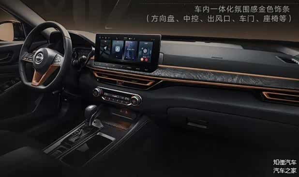 看完了减配,再看看车身,日产天籁黑金版尺寸仍旧是4906*1850*1447mm,外观上延续了现款的设计,主要提供专属黑金个性化装饰,熏黑的前脸及进气隔栅、车内金色装饰(方向盘、出风口、中控、座椅等等)、车尾的字体尾标也是改为金色。