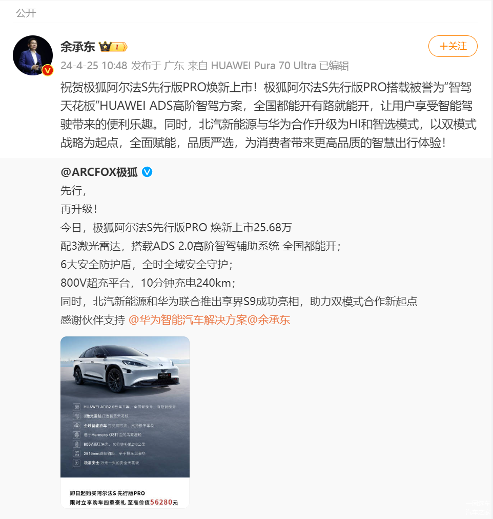 4月25日,2024北京车展,极狐阿尔法S先行版PRO正式上市,售价:25.68万元。